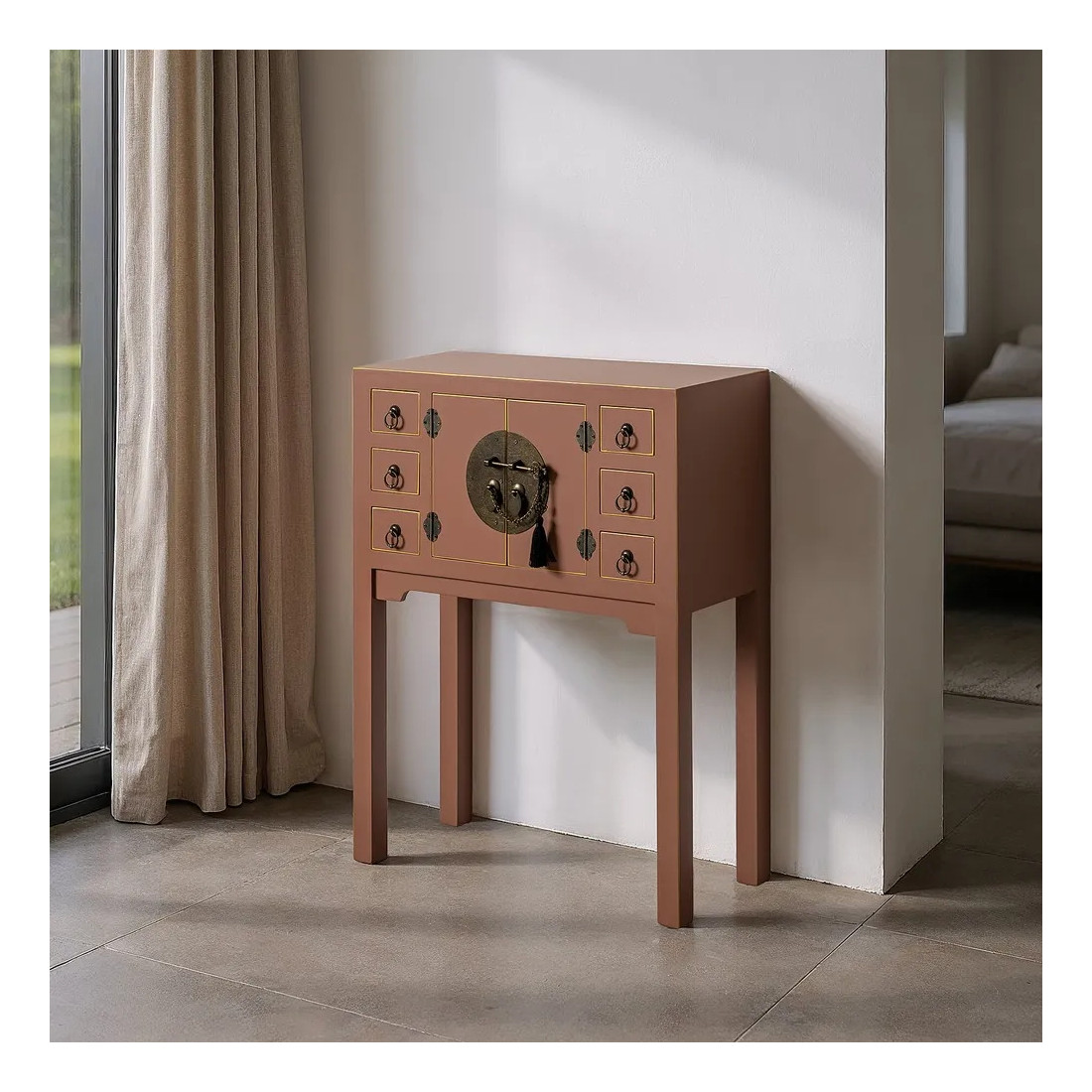Cette petite console chinoise concentre deux portes et six tiroirs. Ces rangements lui confèrent un air coquet, ordonné et décoratif. S’ajoutent naturellement à cette conception tous les détails de style asiatique, notamment la quincaillerie : poignées de tiroir, verrou et plaque centrale, pompon, encadrements dorés... Certains modèles arborent en outre des motifs raffinés qui se marient parfaitement avec leur finition vieillie. Cette console se décline en de nombreux coloris : démarquez-vous facilement avec une console chinoise rouge !