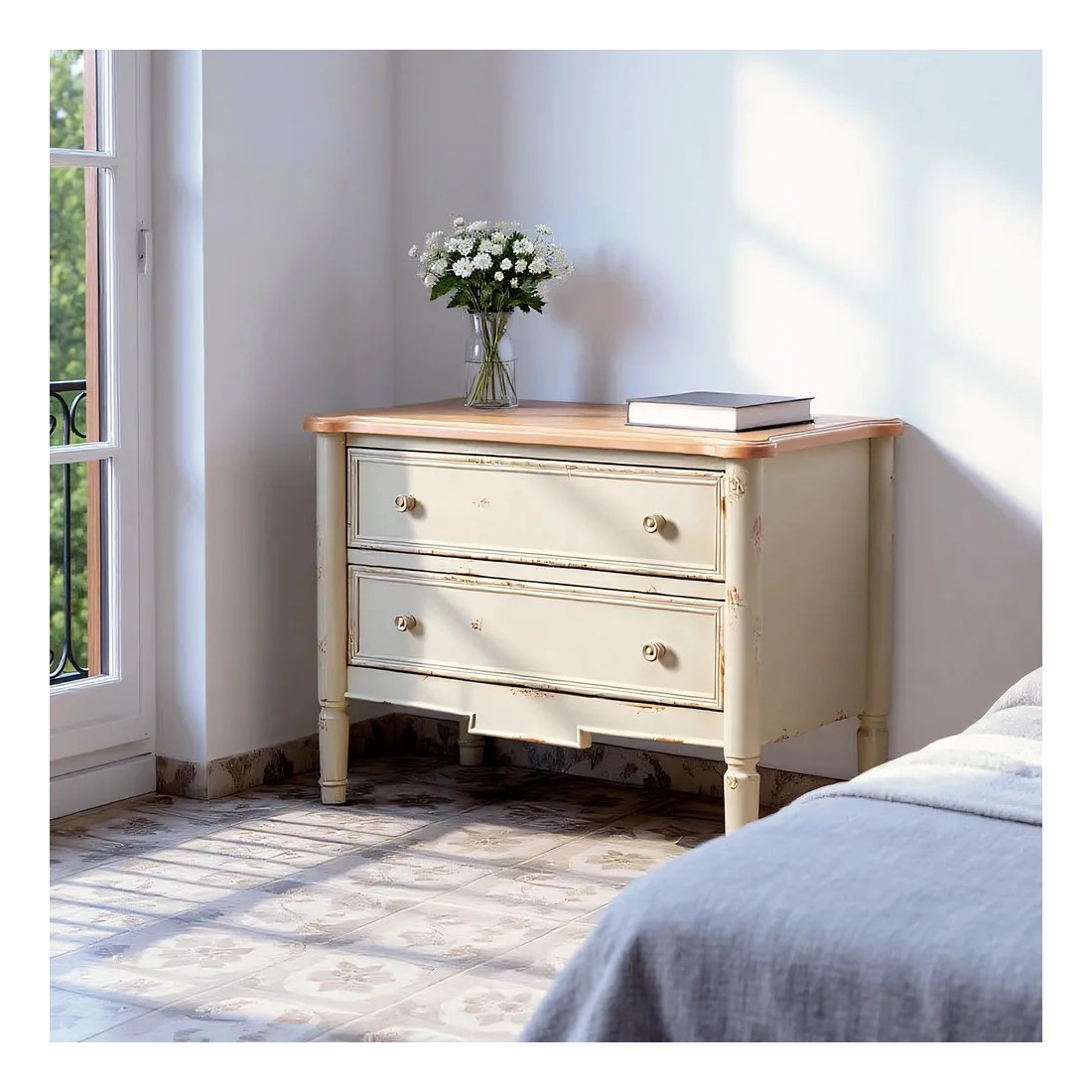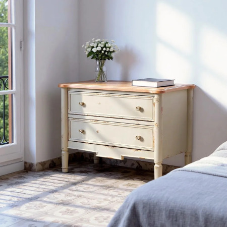 De style classique cette commode 2 tiroirs est fabriquée en bois de pin. Elle dispose d'une patine antique de couleur crème ou marron selon le modèle choisi. Ses deux tiroirs ouvrent à l'aide de petites poignées rondes qui viennent parfaire son look rétro.