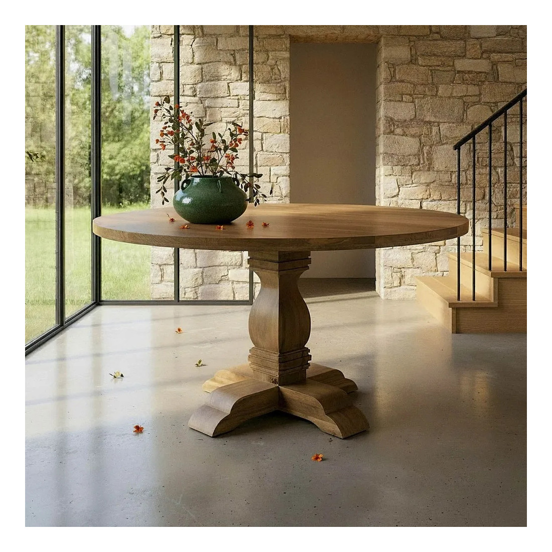 Vintage, sobre et à la fois très cossue, cette table ronde de couleur naturelle viendra parfaitement s'intégrer dans votre salle à manger ou cuisine quelle soit rétro ou moderne. Avec son piètement central en forme de balustre et son diamètre disponible en 120 cm ou 150 cm vous pourrez accueillir jusqu'à 10 convives en fonction du modèle et des chaises choisies. Stable, son balustre central vient reposer sur un pied en croix.