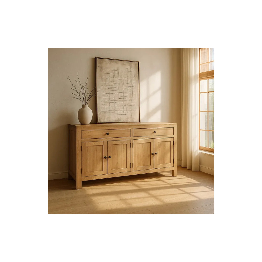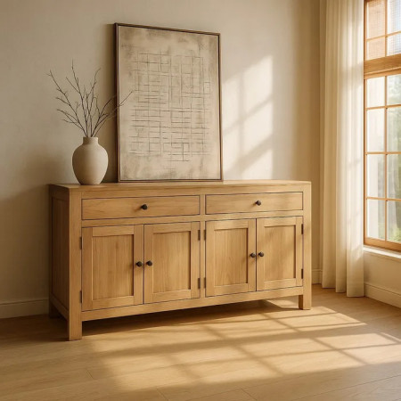 Il sera parfaitement mis en valeur dans votre pièce de vie, ce magnifique buffet aux 4 portes et 2 tiroirs dans le bois de mindi naturel. Voilà un meuble unique qui apporte beaucoup de cachet à la pièce et qui garanti une grande qualité puisqu'il est réalisé dans un bois massif.