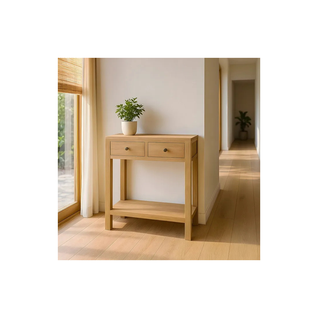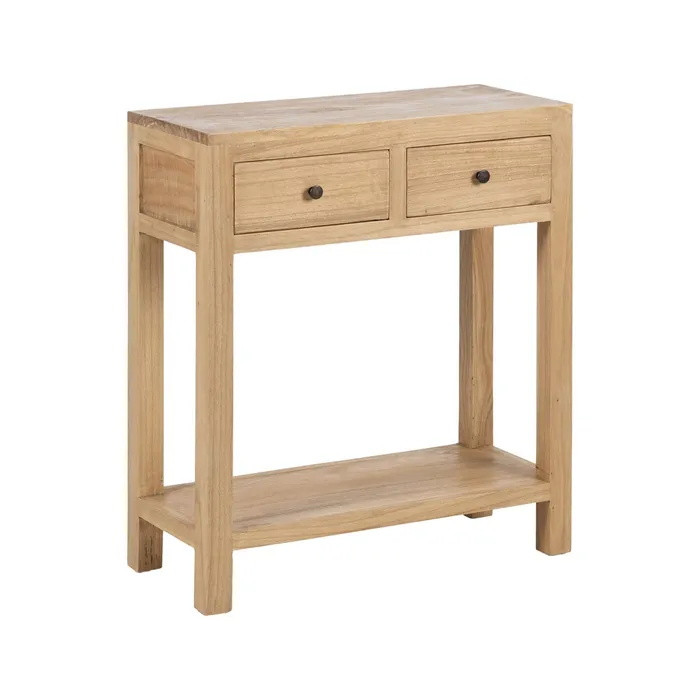 Voici un meuble d’appoint pratique et très esthétique pour votre hall d'entrée ou votre pièce à vivre. Doté de 2 tiroirs, cette console aux petites dimensions a été fabriquée en bois massif de mindi. Les boutons ronds patinés viennent compléter la finition de ce meuble discrètement.