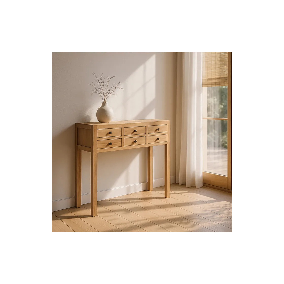 Vous pouvez tout à fait décider de placer cette grande console en bois de mindi dans votre bureau tout comme dans la chambre à coucher où elle servira de meuble tv ou de coiffeuse.
