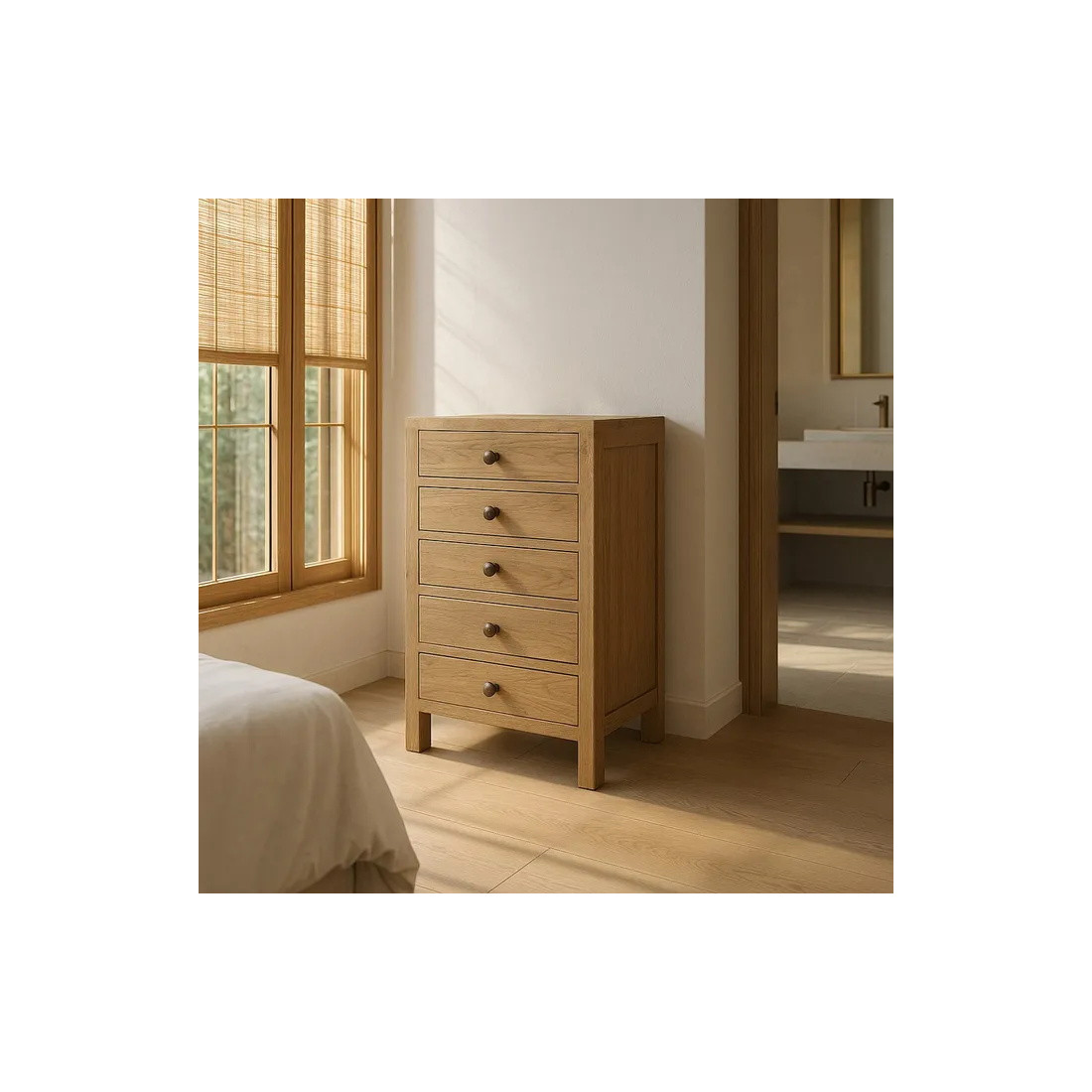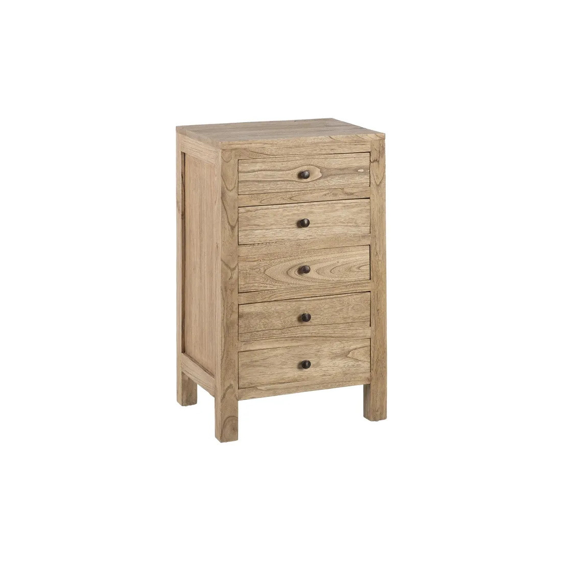 Ce petit meuble chiffonnier apporte dans un intérieur une touche naturelle grâce à son bois de manguier clair. Ce chiffonnier 5 tiroirs moderne et aux lignes rectilignes, se logera facilement dans n'importe quelle pièce de votre habitation. Son étroitesse en fait un meuble d’appoint idéal, facile à placer dans toute la maison juste là où on en a besoin.