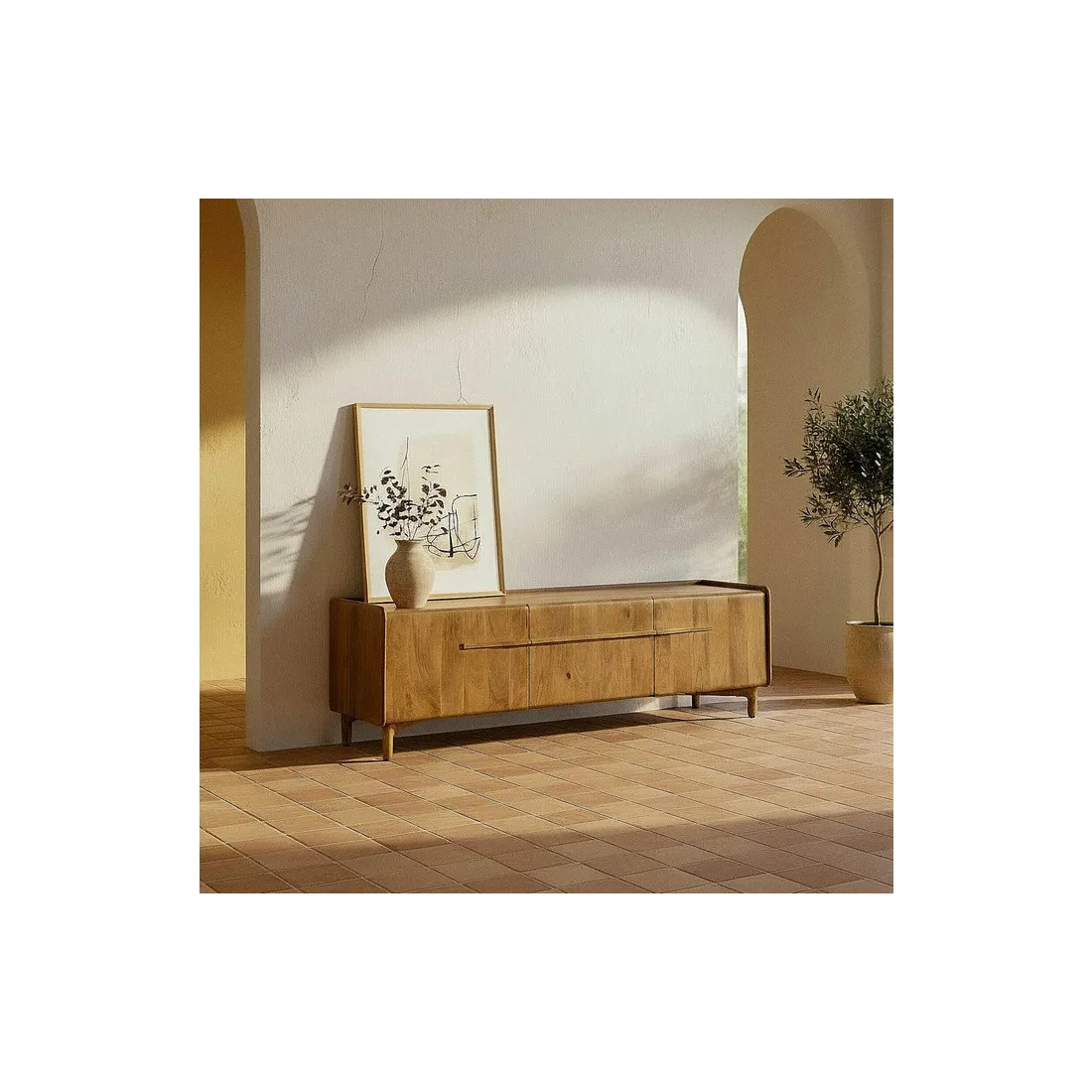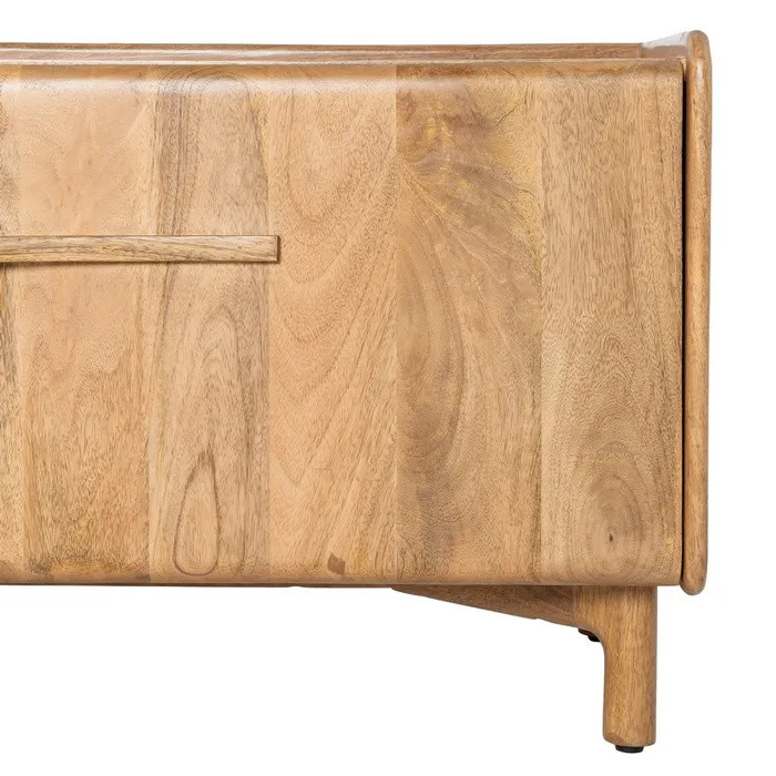 Voici un meuble TV naturel et esthétique réalisé en bois de manguier massif et disposant de 2 portes latérales et 1 tiroir central. Tout en rondeur, il viendra réchauffer la décoration de votre salon tout en vous offrant de nombreux rangements pour vos affaires personnelles et votre hifi.