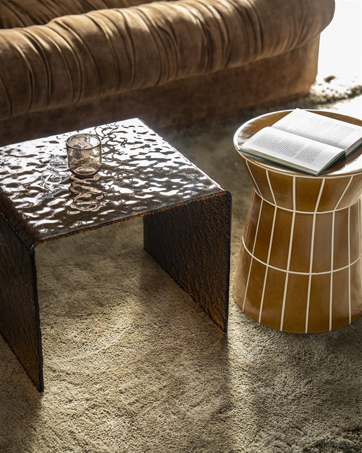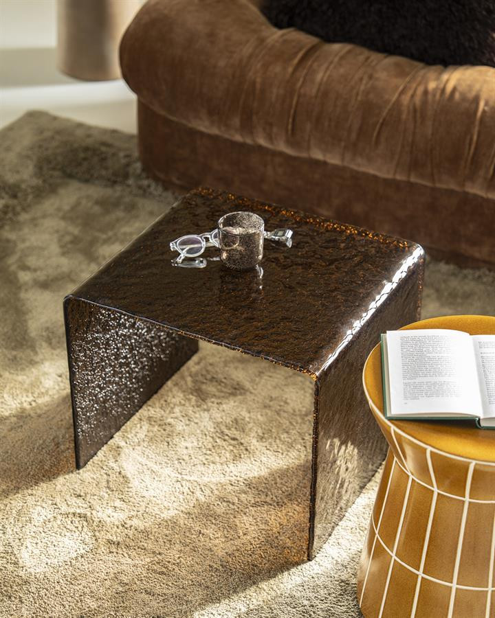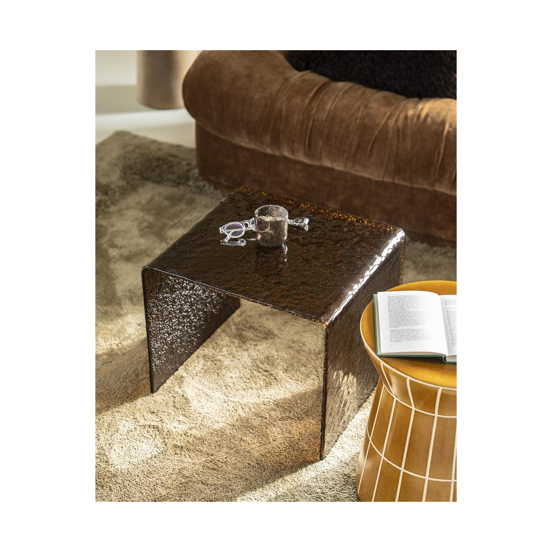 Entièrement réalisée en verre texturé et fumé, cette table d'appoint ou table basse monobloc et minimaliste se fera discrète dans votre intérieur. N'hésitez pas à la mettre en valeur au centre de votre espace détente dans le salon en y rajoutant un bouquet de fleurs ou des bougies d'ambiance pour vos soirées romantiques.