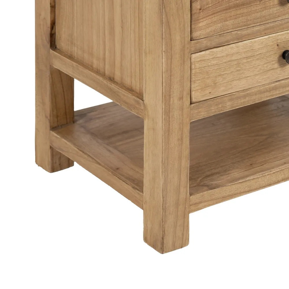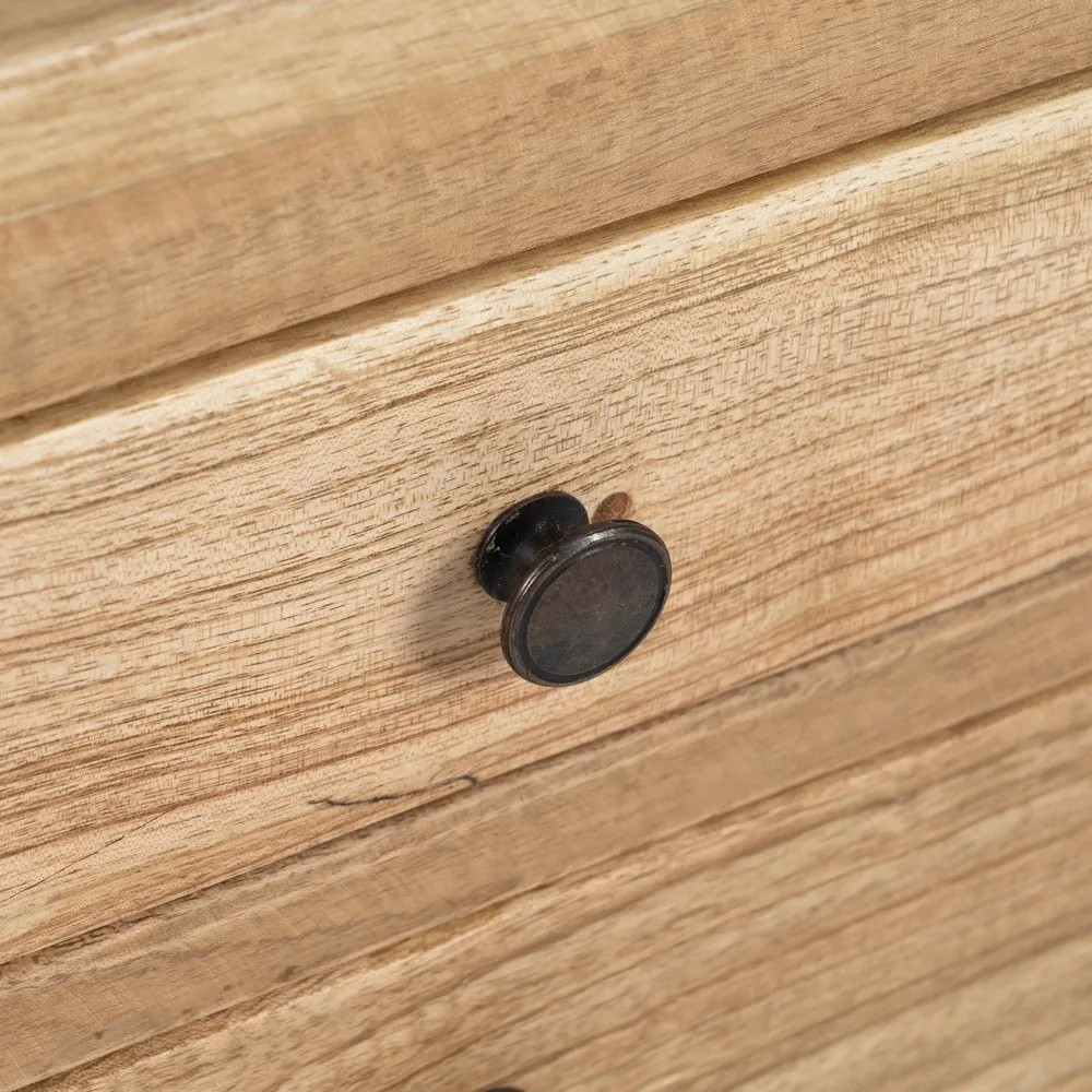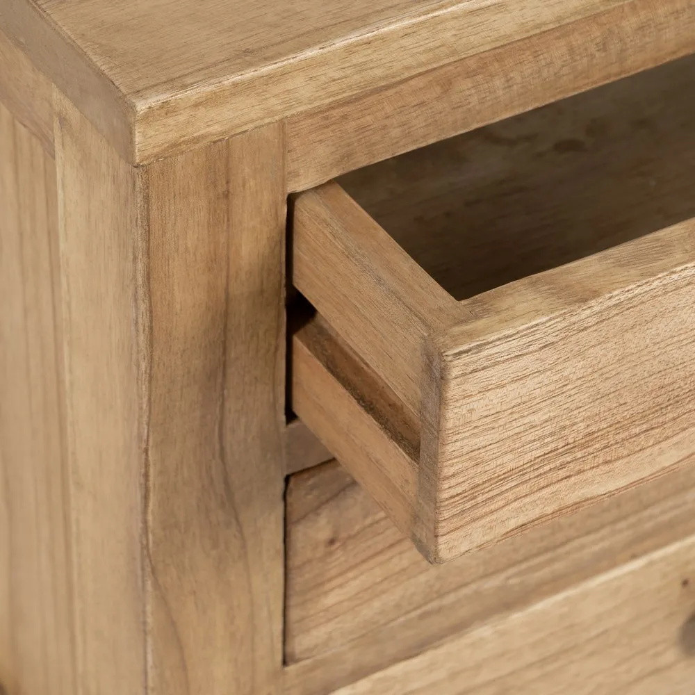 En guise de meuble d'appoint pour le salon à côté de votre canapé, dans l'entrée de votre maison ou dans la chambre à coucher, ce chevet en bois massif de mindi vous offre 3 tiroirs et une tablette de rangement en partie basse.