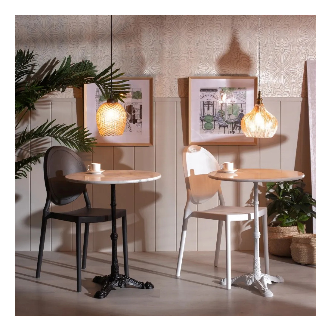 Traditionnellement associé au style classique, le marbre a tout pour séduire également dans des intérieurs de caractère où l'on revisite le style vintage..., comme en témoigne cette table de bistrot en marbre blanc aux matériaux intemporels. Cette couleur claire lui permet de trouver sa place dans toutes les salles à manger ou cuisines en y apportant une note originale et forte. La pierre est ici travaillée avec beaucoup de finesse pour donner naissance à un plateau chic ayant conservé toutes les particularités qui font du marbre un matériau si prisé dans l’architecture depuis l’Antiquité. Chaque plateau étant ainsi unique par ses veinages et tons de couleurs selon les arrivages.