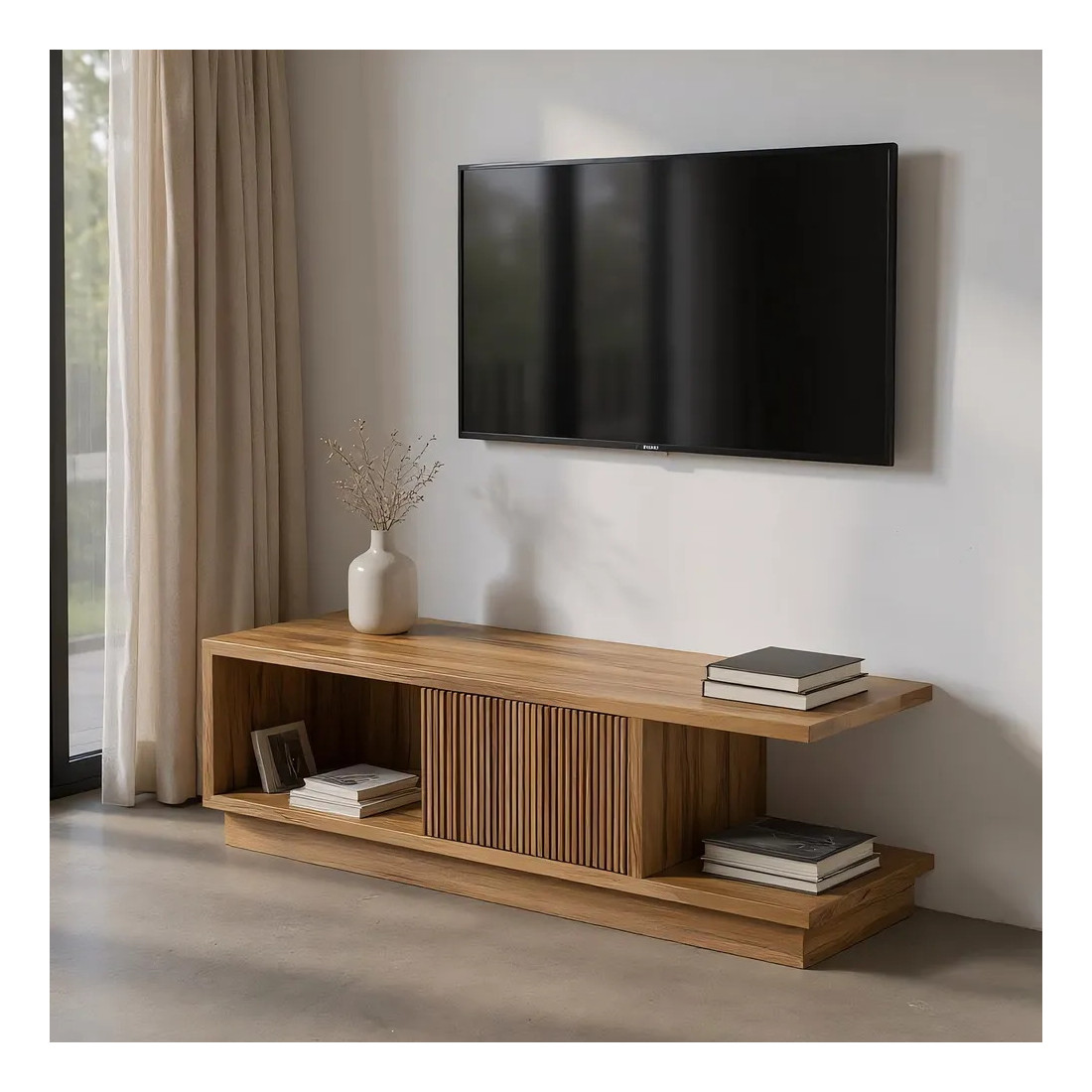 Dans un style moderne et épuré, ce meuble TV rectiligne est réalisé en bois de teck massif. Une porte coulissante à la façade striée permet de dissimuler vos appareils électronique, il s'intègrera à merveille dans un salon moderne et apportera une touche naturelle et cossue à votre décoration d'intérieur.