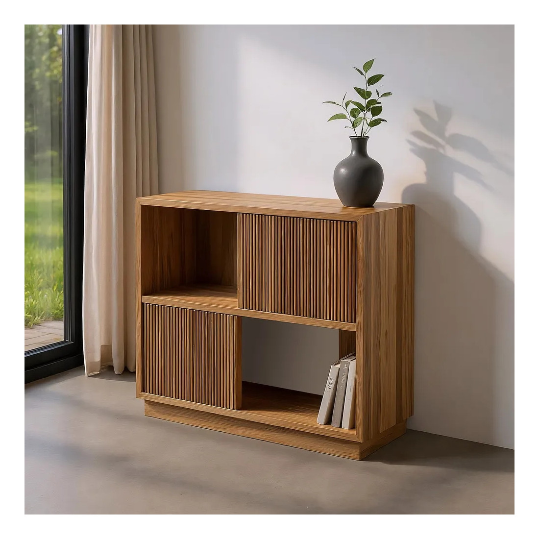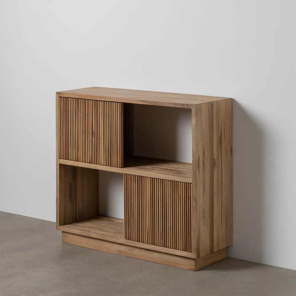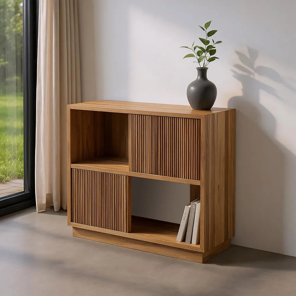 Petit meuble d'entrée avec deux portes coulissantes aux façades striées pour un effet contemporain et à la fois chaleureux. Idéalement placé dans un hall d'entrée, un couloir ou la pièce de vie, ce meuble d'appoint est très pratique pour y ranger tous vos livres et objets de décoration et plantes vertes.