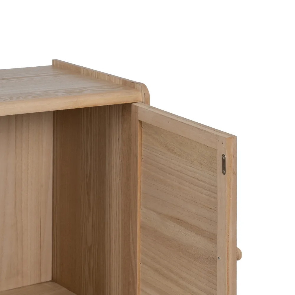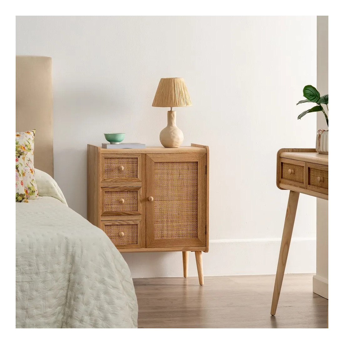 Très pratique avec ses petites dimensions, ce meuble d'appoint avec 3 tiroirs et un espace de rangement derrière sa porte à la façade en rotin sera parfait dans n'importe quelle pièce de votre maison.
