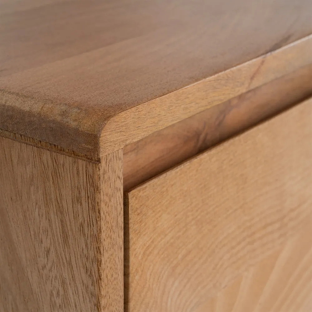 Avec un design rectiligne mais aux angles arrondis, ces portes sont dépourvues de poignées visbiles afin de garder intacte sa longue façade sobre ! Quant au piètement surélevé, il apporte un côté aérien à l'ensemble du meuble. Ce grand meuble TV en bois massif de manguier se confondra parfaitement dans un univers au style Japandi (Scandinave Japonais) tout en apportant une touche sophistiquée à votre maison.