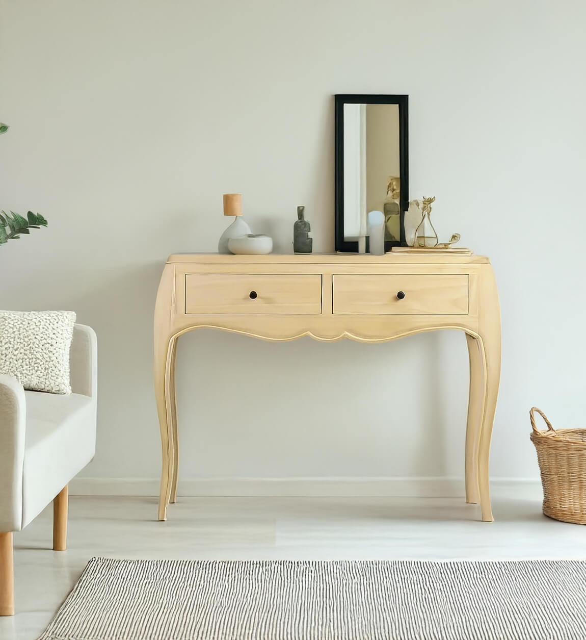 Pratique dans de nombreuses pièces de la maison, ce meuble d’appoint avec ses pieds légèrement galbés pour reprendre les codes d'un style classique, cette console vous sera d'une grande utilité où vous pourrez ranger vos effets personnels dans les 2 tiroirs prévus à cet effet.