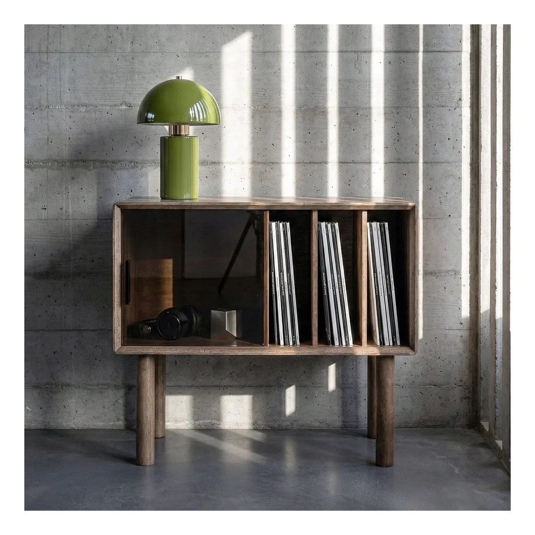 idéal pour y ranger tous vos vinyles et autres objets, ce meuble d'appoint bas a été réalisé en bois d'hévéa avec une porte vitrée coulissante légèrement fumée.