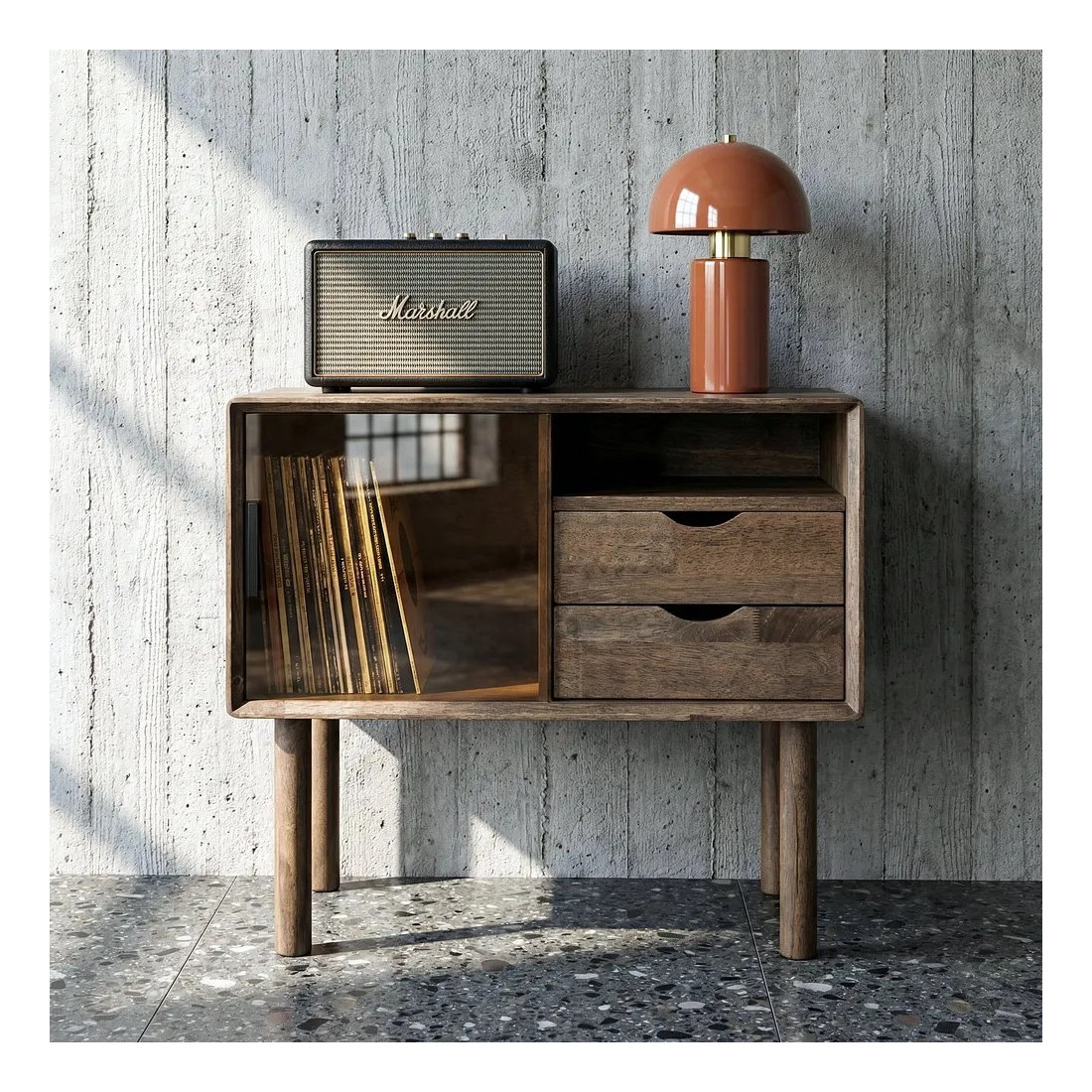 idéal pour y ranger tous vos vinyles et autres objets, ce meuble d'appoint bas a été réalisé en bois d'hévéa avec une niche de rangement, deux tiroirs et un espaces derrière une porte vitrée coulissante légèrement fumée.