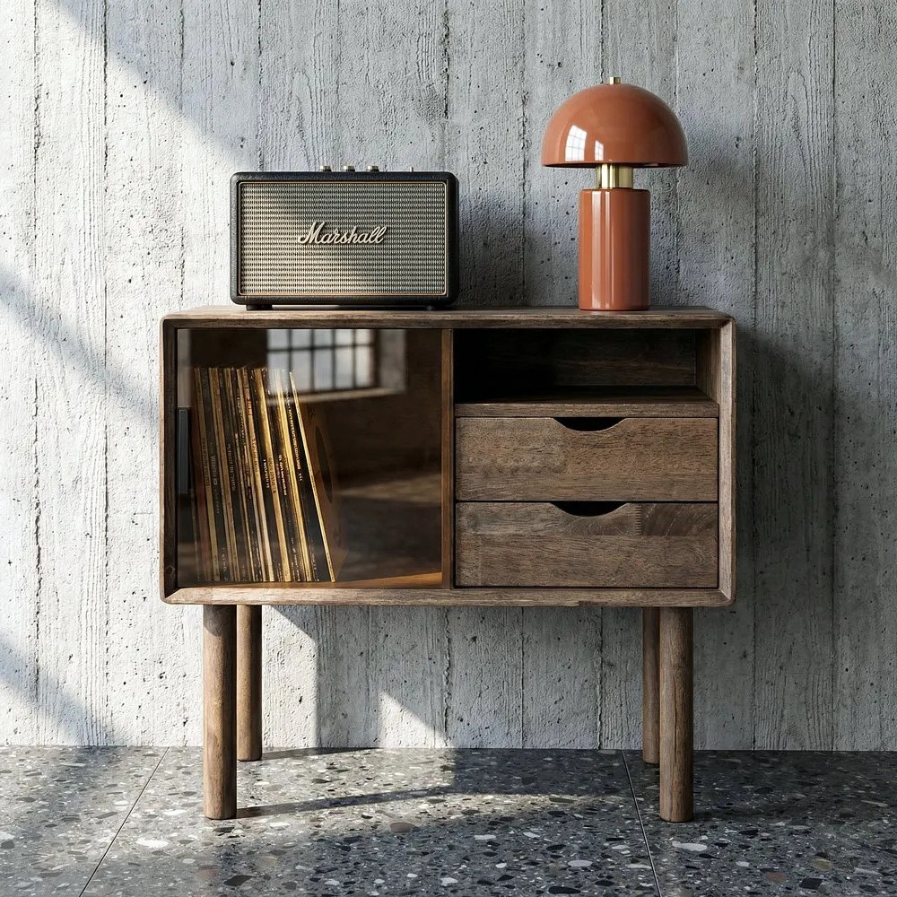 Voici un petit meuble d'appoint parfait pour un hall d'entrée ou pour le salon ! Avec ses dimensions idéales, ni trop grand ni trop petit, ce meuble pour vinyles saura acceuillir tous vos disques préférés dans le compartiments avec sa porte coulissante vitrée... En partie droite du meuble, vous trouverez 2 tiroirs et un niche ouverte pour y ranger tous vos effets personnels qui resteront toujours à portée de main.