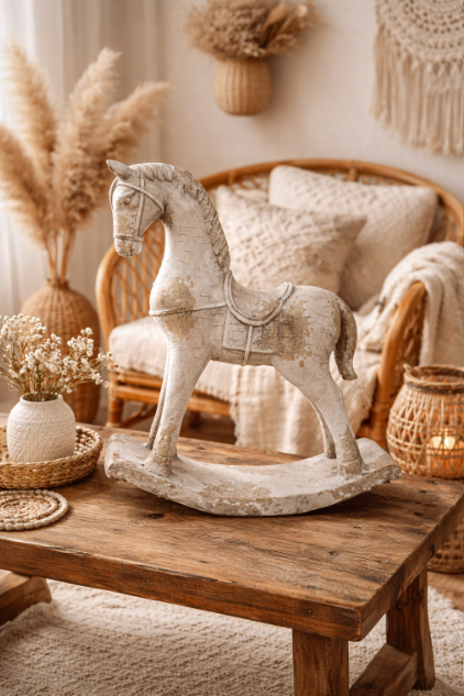 Ce cheval à bascule décoratif incarne l’alliance parfaite entre authenticité et élégance contemporaine. Conçu en MGO, il présente un rendu minéral sophistiqué qui rappelle les sculptures anciennes tout en s’intégrant parfaitement dans des intérieurs modernes.