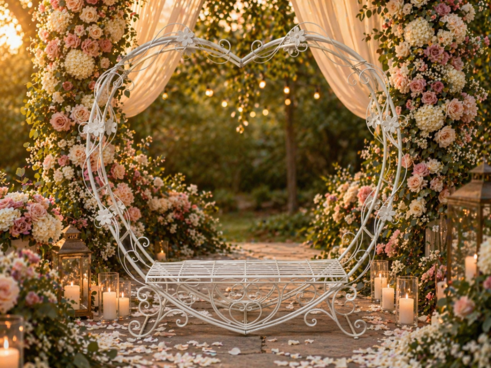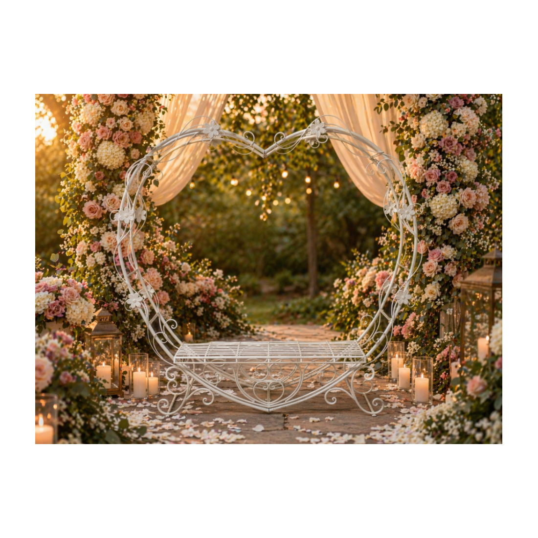 Associez ce banc cœur à des compositions florales pastel, des guirlandes lumineuses ou des bougies pour créer un décor digne d’un conte de fées. Parfait pour :